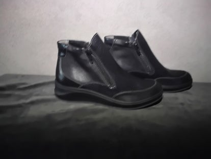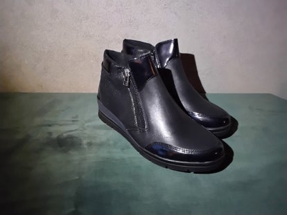 Lederen enkellaarsje met dubbel rits en uitneembaar voetbed. Laatste maat 38